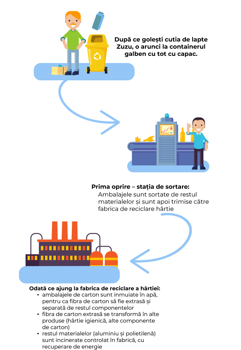 Pentru o colectare și reciclare corectă, alege containerul galben pentru a arunca cutiile de lapte Zuzu